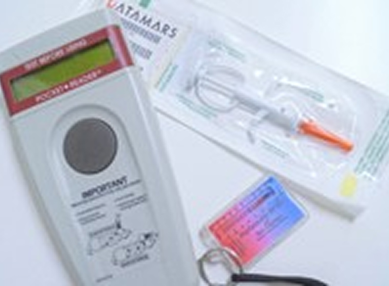マイクロチップとは、直径2mm、長さ1cm程度の円筒形の電子標識器具で、それぞれのチップには、世界で唯一の15桁の数字(番号)が記録されています。